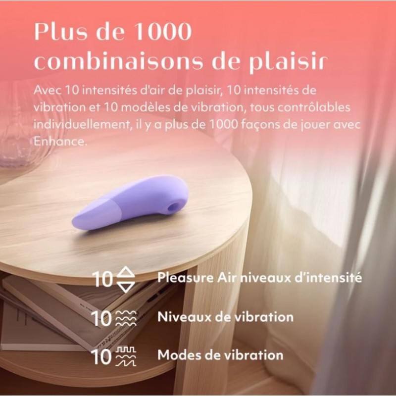 la technologie de stimulation clitoridienne signature de Womanizer combinée aux vibrations puissantes de We-Vibe pour des sensations décuplées. C'est le premier produit Womanizer à atteindre un taux d'orgasme de 100 % lors des tests utilisateurs. Avec 10 niveaux d’intensité d'air, 10 niveaux de vibration et 10 modes de pulsations, tous ajustables indépendamment, explorez plus de 1000 combinaisons pour un plaisir sur mesure.