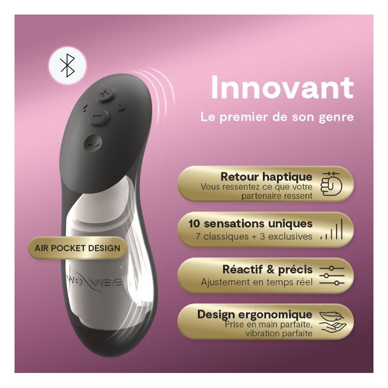 Son contrôle tactile Haptic Squeeze réagit à la pression de la main : plus vous serrez, plus le plaisir monte. Connecté à l’application We-Connect, il vous permet de jouer ensemble, où que vous soyez, dans une complicité absolue.