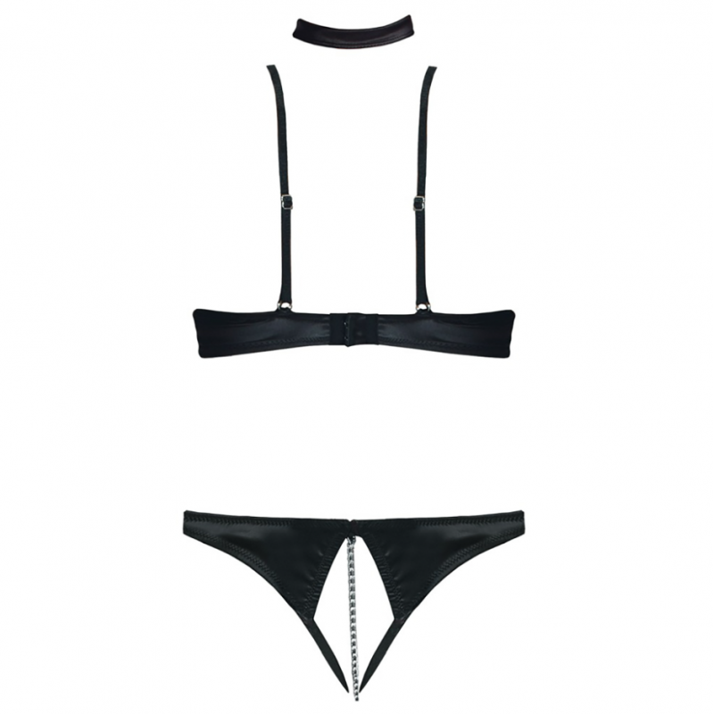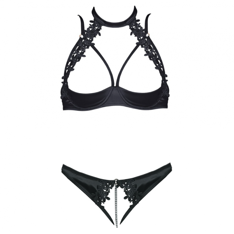 Composé d’un string ouvert et d’un soutien-gorge collier, il se distingue par ses broderies florales sophistiquées, délicates et envoûtantes.
