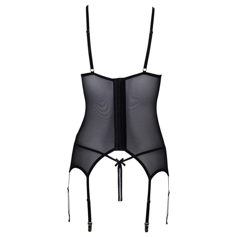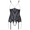 Les bretelles réglables dans le dos assurent un ajustement parfait, tandis que le porte-jarretelles se ferme à l’arrière par une fermeture à crochets. Les six jarretelles sont réglables en longueur pour un maintien idéal. Le string assorti, ouvert à l’avant et orné de dentelle, est sublimé par une chaîne d’entrejambe stimulante, également amovible.