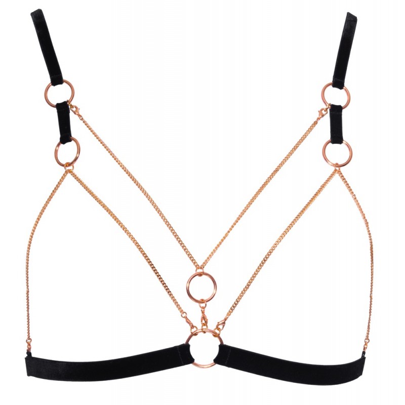 Conçu en rubans de velours élastique d'un noir profond, il est magnifié par des chaînes à anneaux d'un chic absolu en coloris or rose.