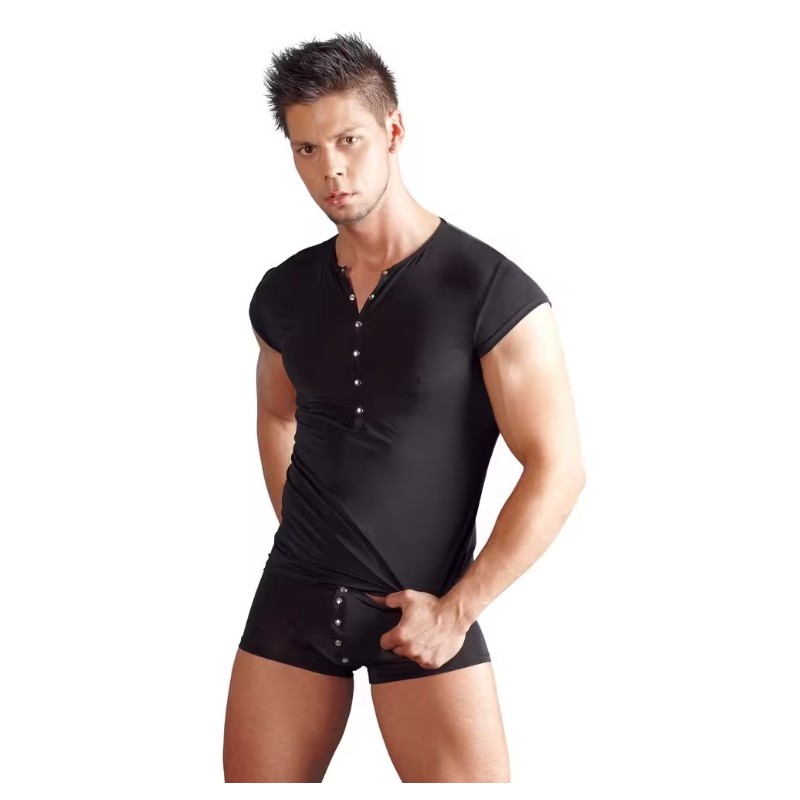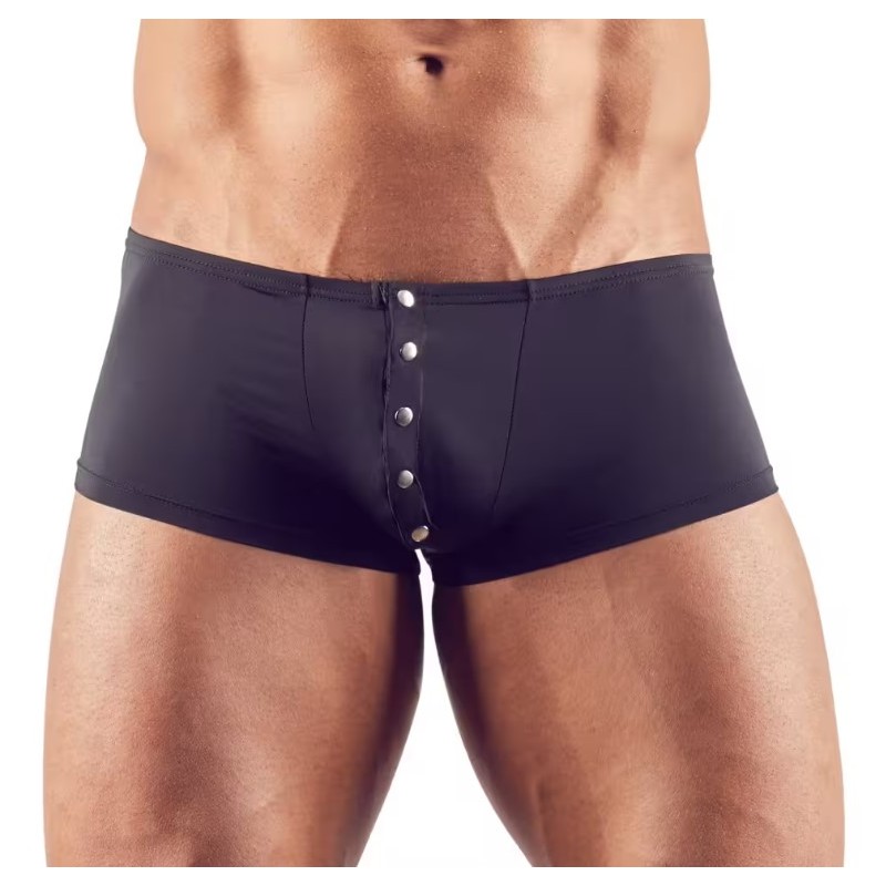 Sa matière lisse et extensible épouse parfaitement les formes pour un effet seconde peau confortable et flatteur. Le panneau avant est structuré par une patte verticale ornée de boutons pression métalliques, apportant une touche graphique et légèrement fétiche tout en mettant en valeur la silhouette.