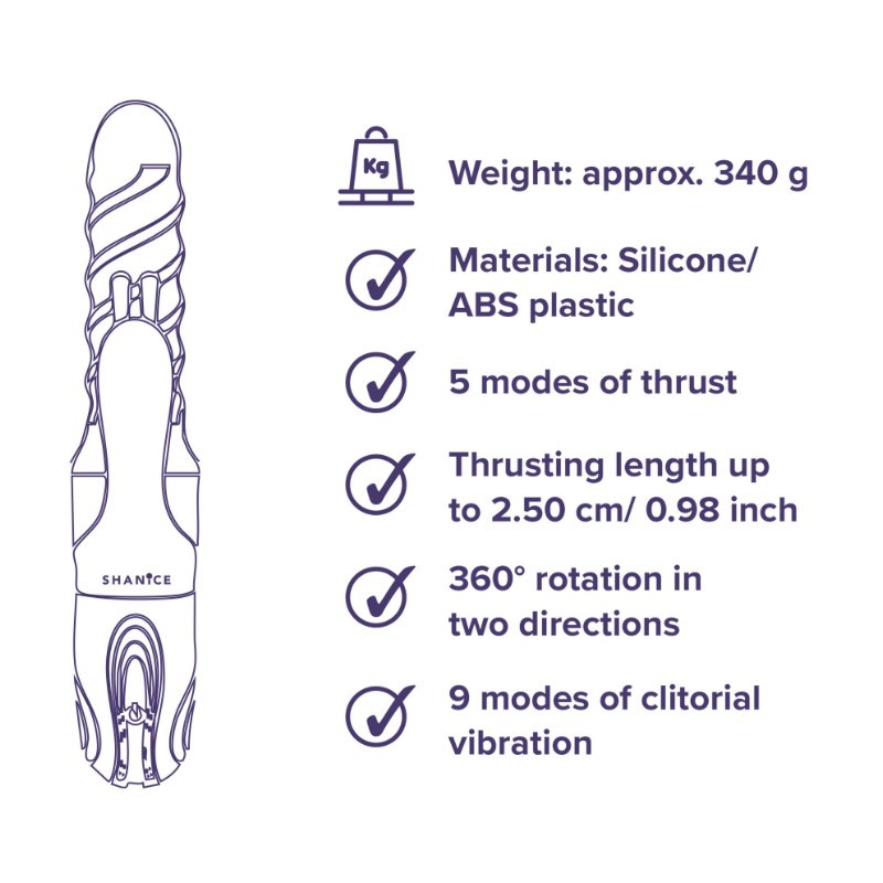 Son design raffiné et féminin dissimule une puissance redoutable. La fonction de poussée profonde associée à la rotation crée une stimulation enveloppante, rythmée et irrésistiblement captivante. Chaque mouvement épouse vos courbes avec précision, pour une sensation intense et délicieusement maîtrisée.