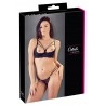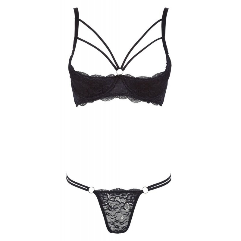Sublimez votre silhouette avec cet ensemble en fine dentelle noire, délicatement orné d’anneaux argentés pour une touche audacieuse et élégante. Le soutien-gorge à armatures, légèrement doublé, offre un maintien séduisant tout en mettant le buste parfaitement en valeur. Ses doubles bretelles extensibles apportent confort et ajustement idéal. Un modèle irrésistible qui allie sensualité et raffinement.