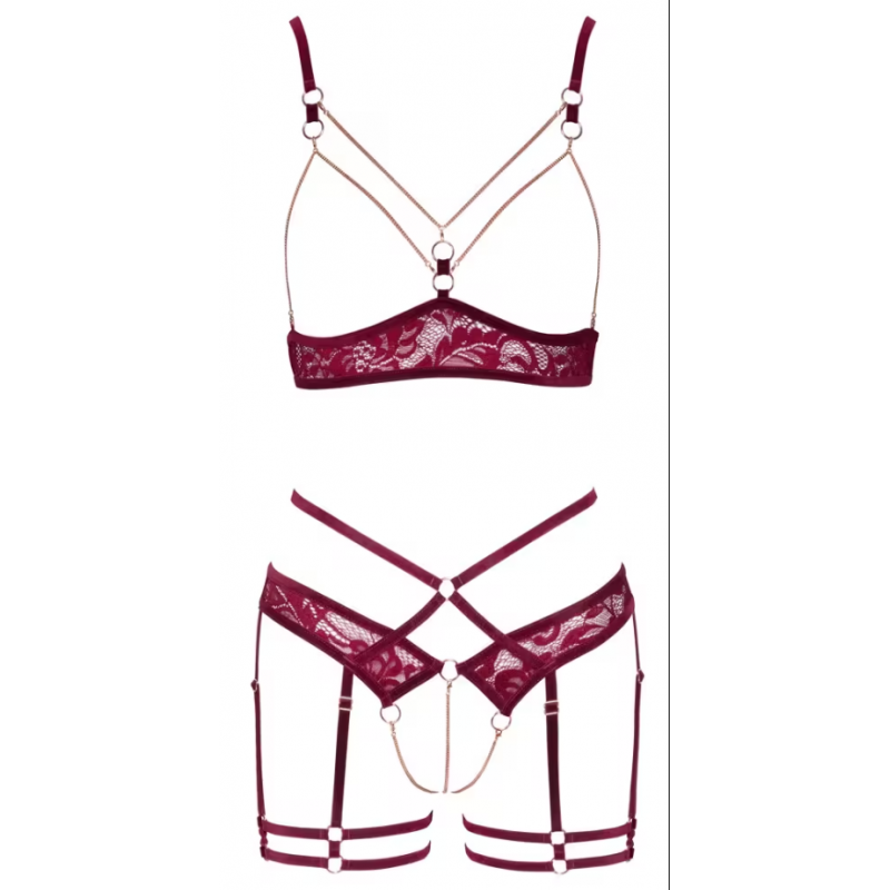 Sa dentelle rouge foncé sublimée par des rubans de velours et des détails couleur or rose crée un look intensément glamour. Les chaînes-bijoux encadrent délicatement la poitrine tandis que les chaînes amovibles à l’entrejambe apportent une touche sensuelle à chacun de vos mouvements.