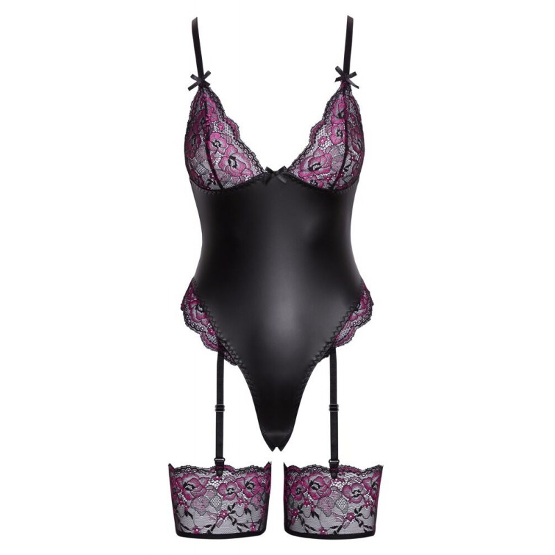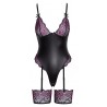 Rachelle - Body Dentelle & Simili Cuir Noir & Mauve - Cotteli Lingerie